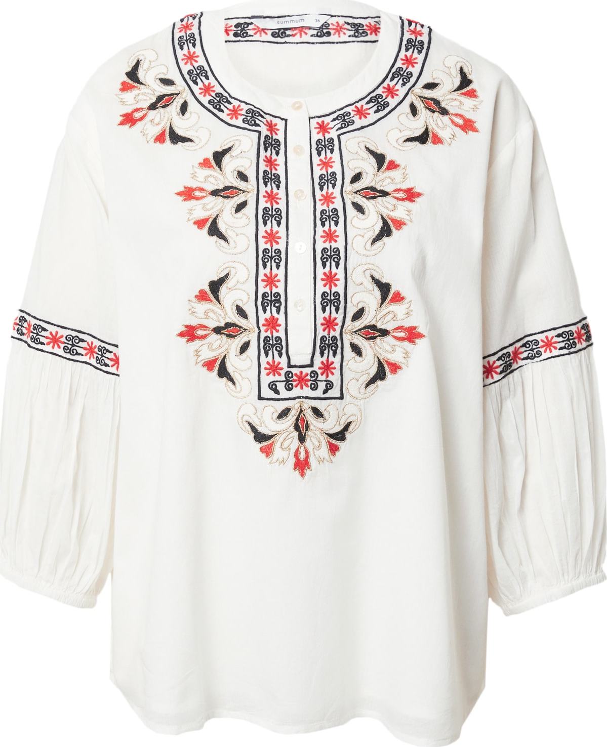 Styl halenky: Halenkové tričko; Design: Prošitý spodní lem, Široký výstřih; Typ uzávěru: Knoflíkové zapínání; Materiál: Bavlna; Vzor: Etno vzor; Košilový límec: Bez límečku; Detaily: Výšivka; Extra: Švy tón v tónu; Střih: Normální střih; Délka rukávu: Tříčtvrteční rukáv; Délka: Normální délka