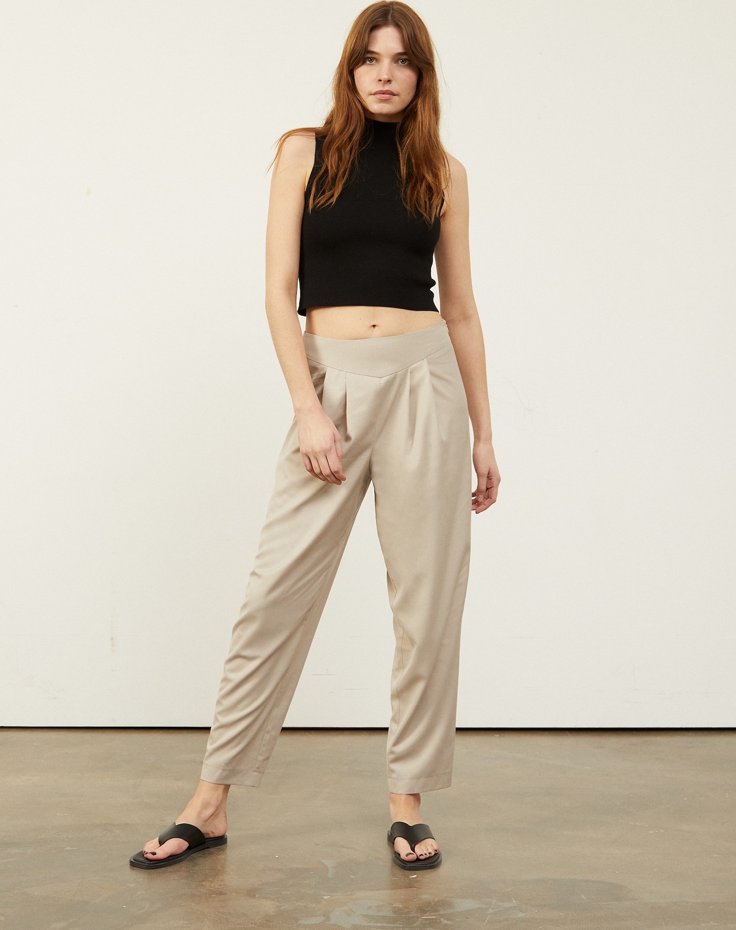 Design: Prošitý spodní lem, Široký pas, Boční zip; Typ uzávěru: Zip; Materiál: Viskóza; Vzor: Jednobarevný; Detaily: Sklady; Extra: Lehká látka, Měkký povrch; Délka: 7/8 délka; Střih: Loosefit; Výška sedu: Střední pas